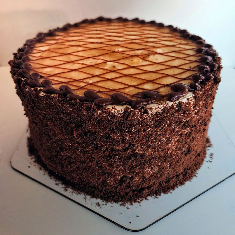Bizcocho de chocolate, relleno con crema de café y manjar.