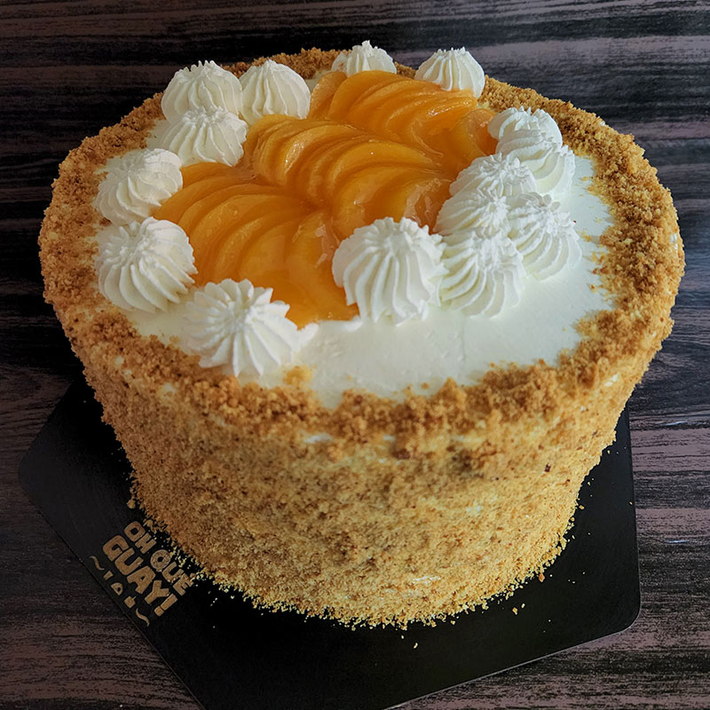 Bizcocho de vainilla, relleno con crema chantilly y trozos de durazno.