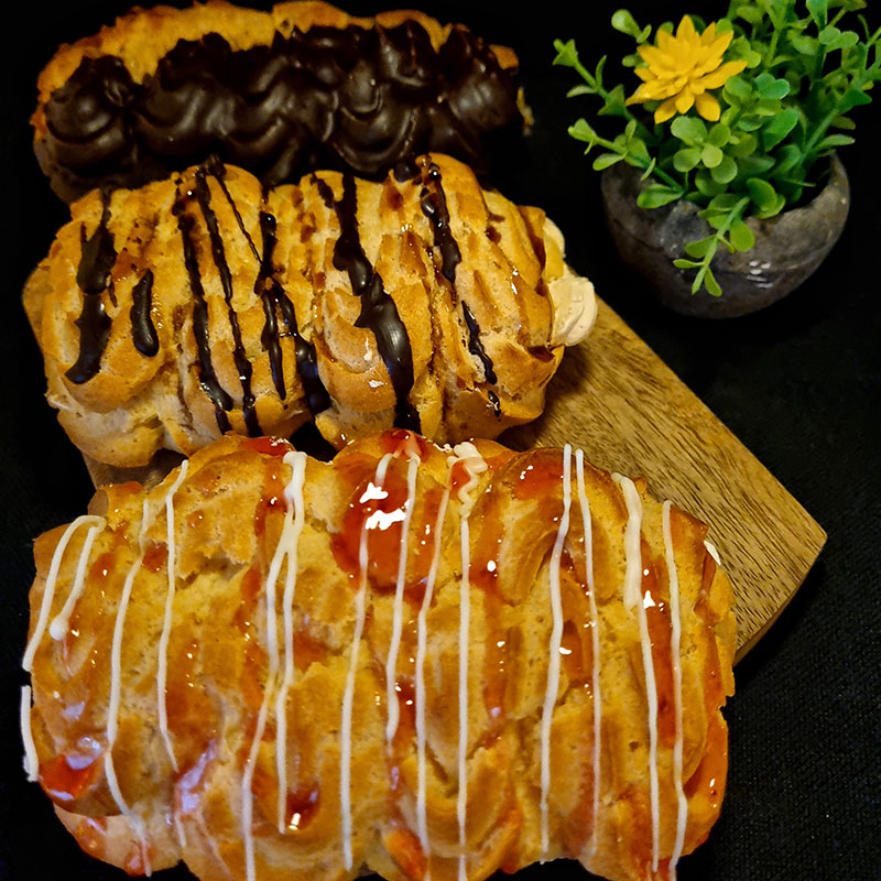 Suave masa rellena de distintas cremas (Crema de frambuesa, crema moka, manjarate o crema tropical).